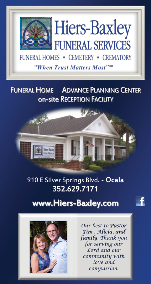 Ocala FL 34470 352-629-7171. Due to COVID restrictions social distancing will be carefully observed. Or send flowers directly to a service happening at Hiers-Baxley Funeral Services - TimberRidge.