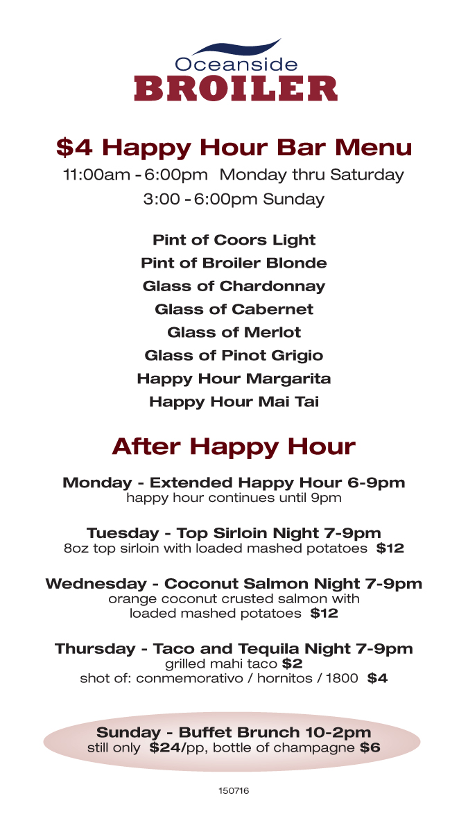 Oceanside Broiler Oceanside. Shrimp Cocktail gf Happy Hour not offered on some holidays.